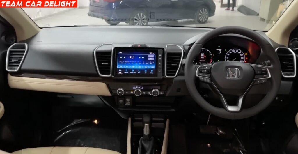 The City looks sharper and more modern than it’s pre-facelift version. It gets a diamond chequered front grille and a sporty front bumper with carbon-wrapped lower parts. The rear also has a carbon-wrapped diffuser and stylish Z-shaped LED tail lamps. Higher variants come with dual-tone diamond-cut alloy wheels that add to the premium feel. Overall, the design is elegant yet sporty, making it stand out without being too loud.