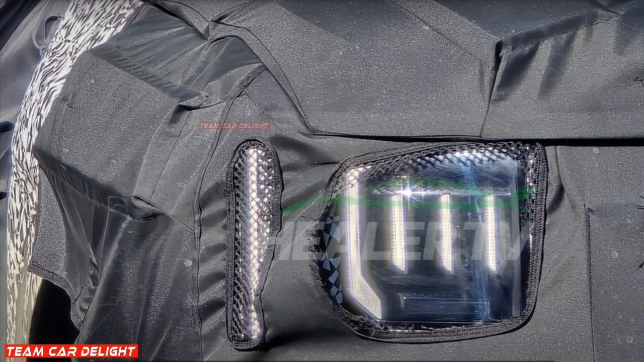 The next-gen Seltos features five vertically stacked LED elements on both ends of its front fascia, replacing the current model’s horizontal layout. Four of these LEDs are housed within a rectangular headlight unit, slightly elongated in shape. Three of them appear uniform in size, likely featuring projector elements between them. The fourth LED, positioned within the headlight cluster, is noticeably taller with a unique design.
