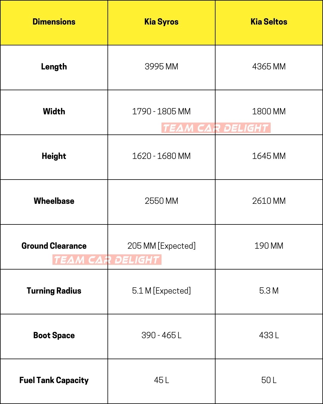 • The fuel tank of the Kia Syros is 5 liters smaller than the Kia Seltos, with capacities of 45 liters and 50 liters, respectively.