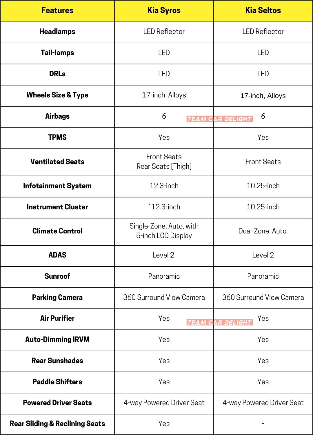 • The Kia Syros has single-zone automatic climate control with a 5-inch LCD display, whereas the Kia Seltos offers dual-zone automatic climate control.
