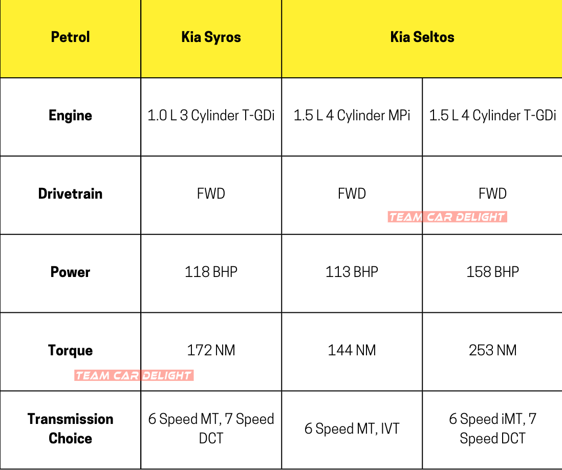 • The Kia Syros petrol model has a 1.0L 3-cylinder T-GDi engine, while the Kia Seltos offers a 1.5L 4-cylinder MPi or a 1.5L 4-cylinder T-GDi engine.