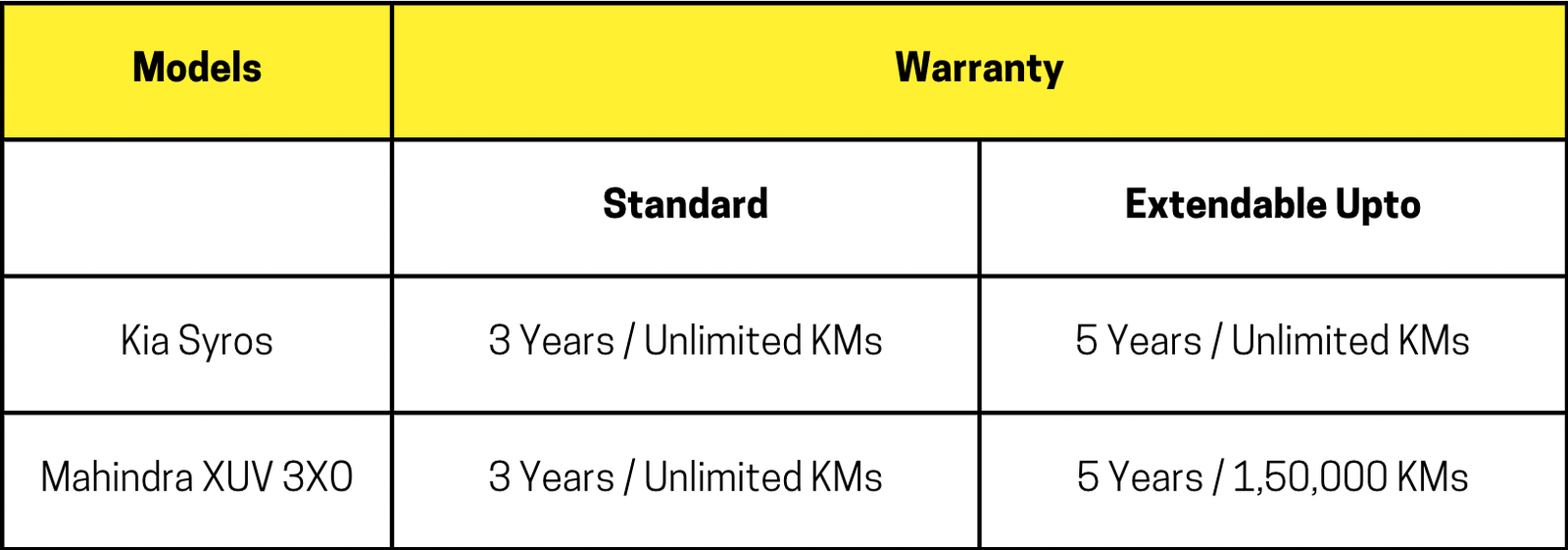- Syros provides an extended warranty of up to 5 years with unlimited kilometers, while XUV3XO limits the extended coverage to 1,50,000 kilometers.