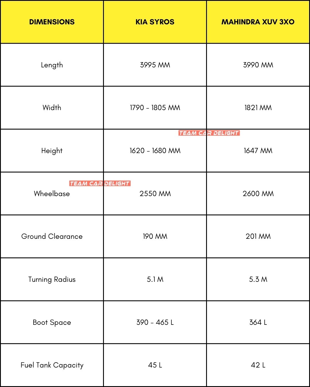Kia Syros vs Mahindra XUV 3XO – Dimensions