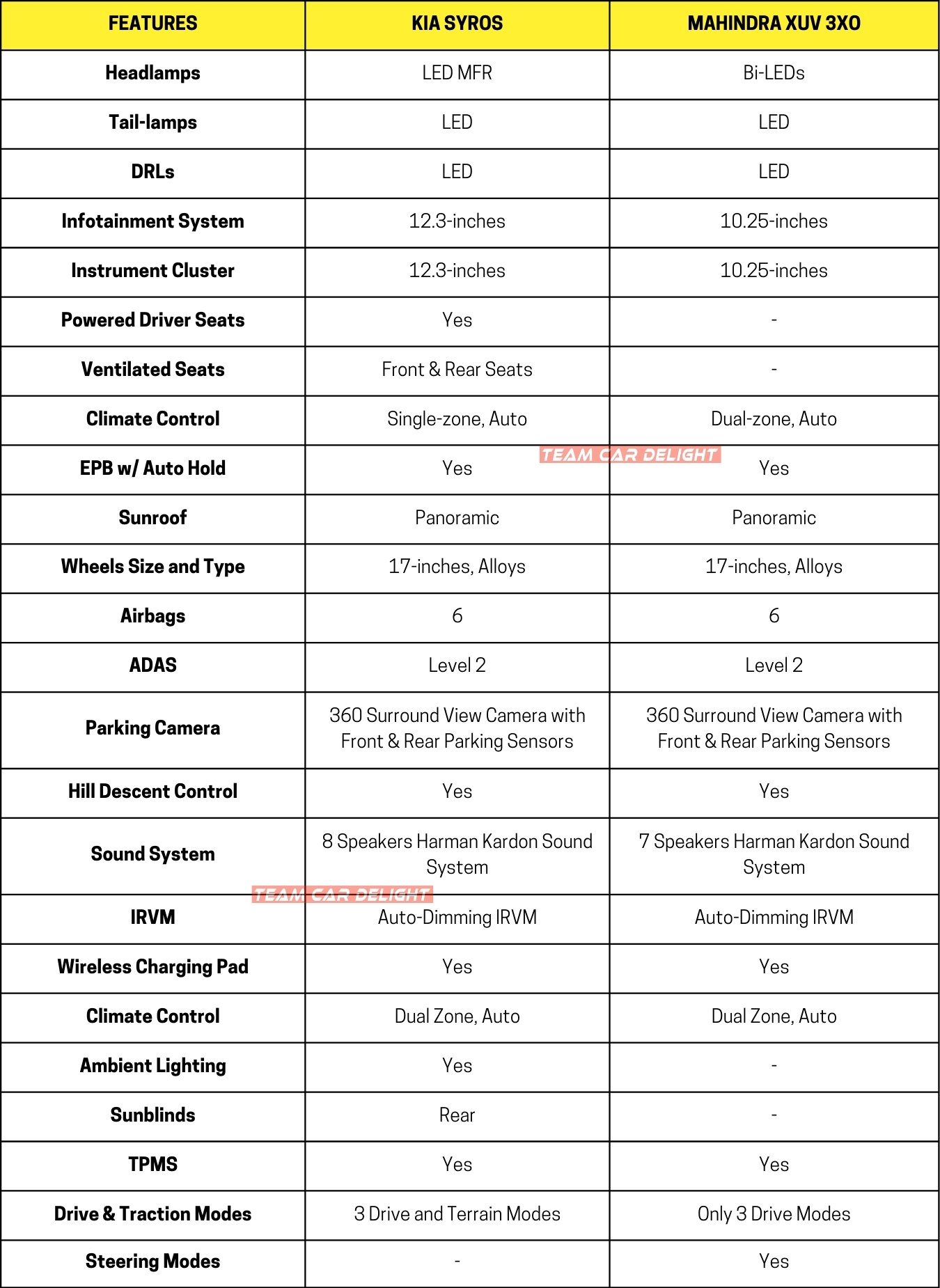 - Syros gets a 7-speed DCT transmission, while XUV3XO has a 6-speed AT.