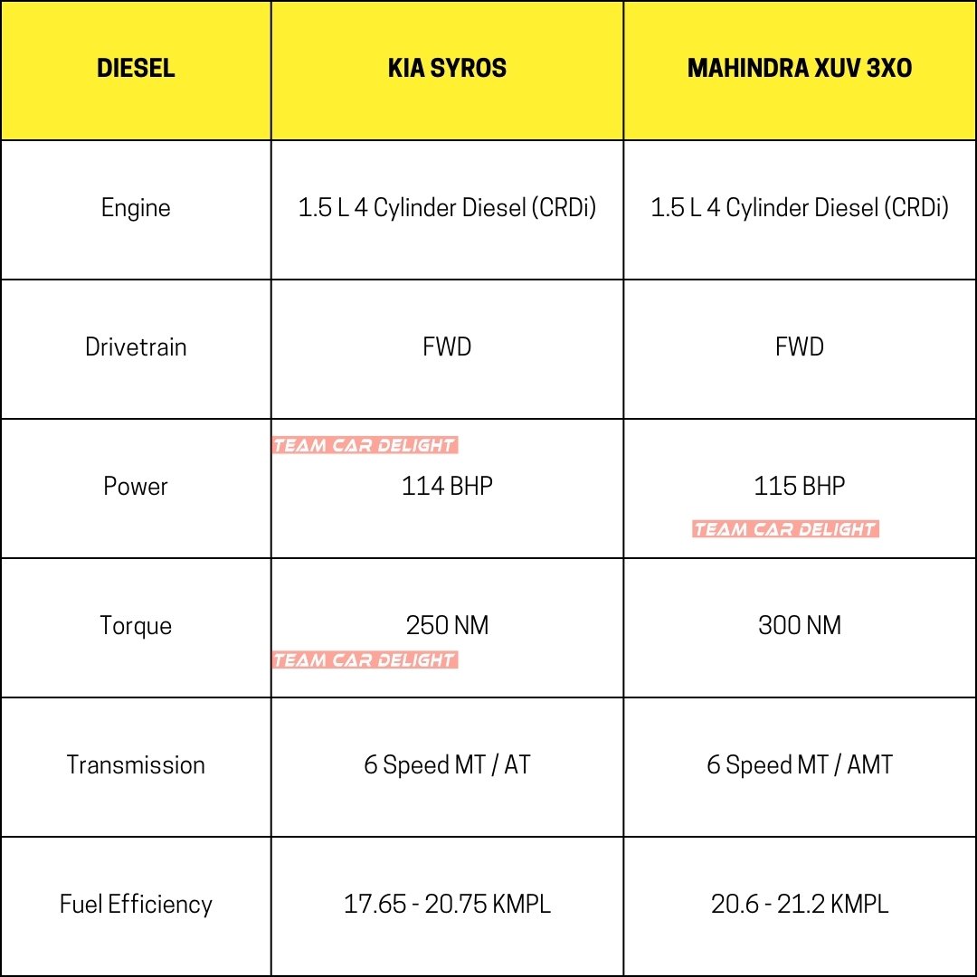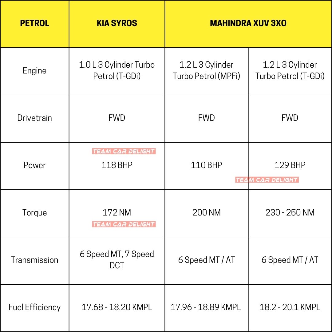 Kia Syros vs Mahindra XUV 3XO – Engine Specifications