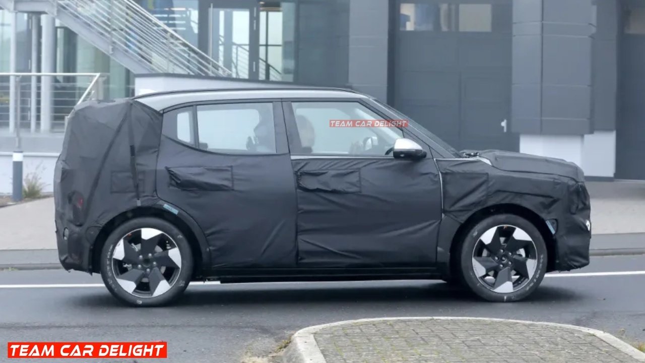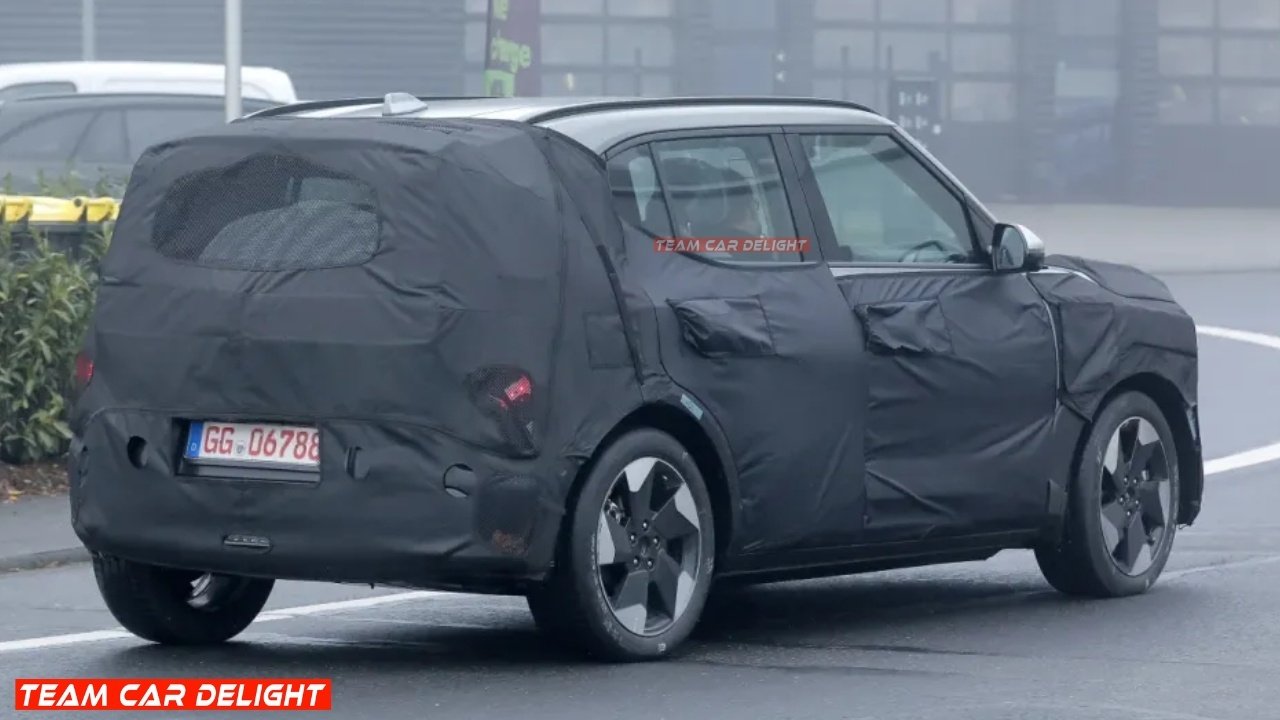 The Kia EV2, as seen in recent spy shots, showcases a compact and boxy profile, aimed at providing a modern yet rugged design. Key styling elements include vertically stacked headlights, a squared-off bonnet, and a flat front fascia. It look reminiscent to another test model spotted in India, rumored to be either the Kia Clavis or Syros.