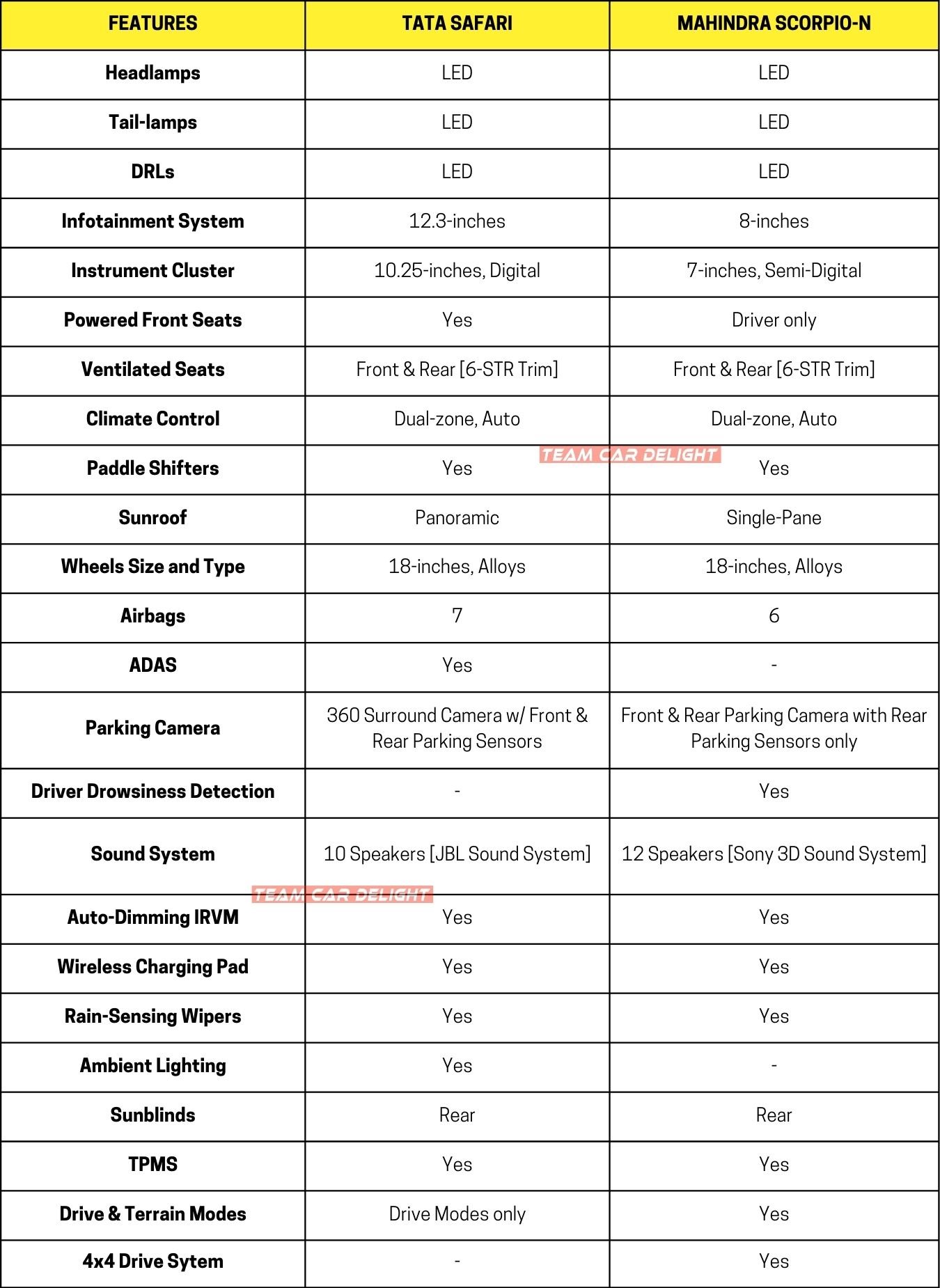 • Mahindra Scorpio-N has a much powerful 2.2 L diesel engine compared to Safari’s 2.0 L engine