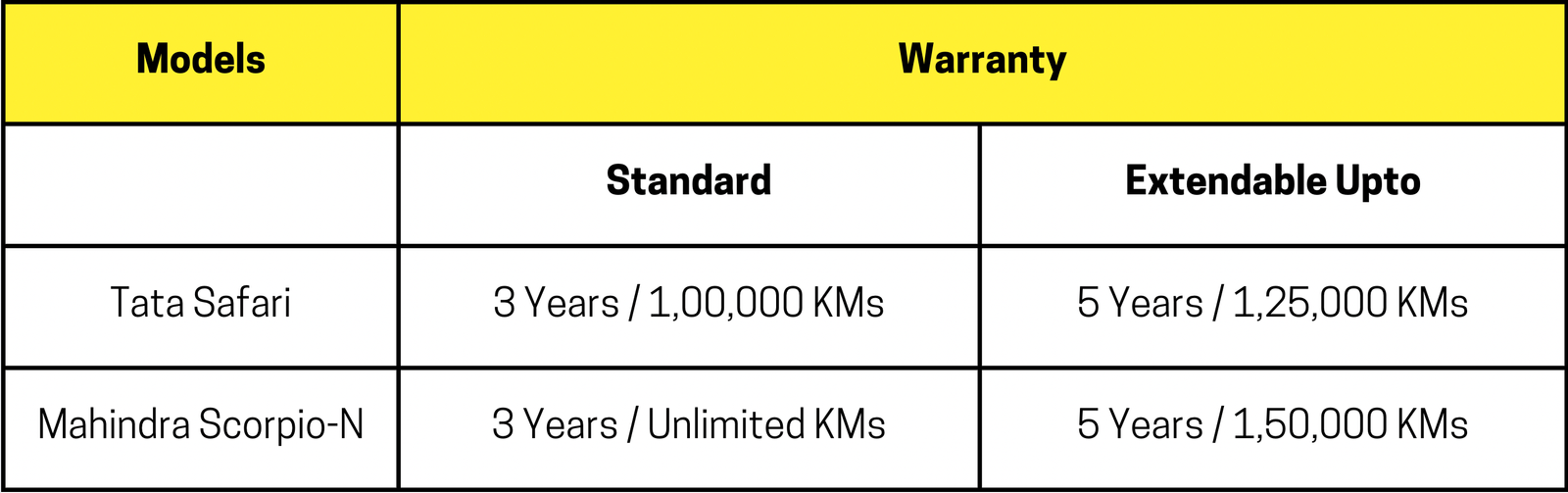 • Mahindra Scorpio-N overall offers a much warranty package compared to the Tata Safari.