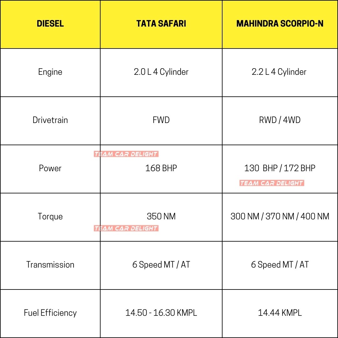 • Tata Safari is more fuel efficient than the Scorpio-N.